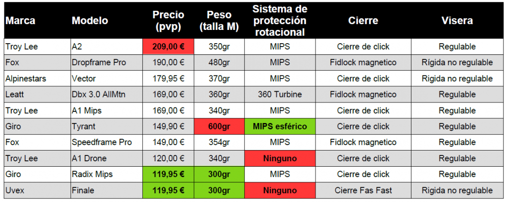 Obviamente no puede traer la misma tecnología un Troy Lee A2 de 209€ que un Uvex Finale 2.0 de 119,95€. Pero vamos a ver con cuales nos quedamos nosotros, siguiendo los 3 criterios que consideramos más importantes.