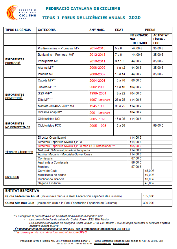 Aquí os dejamos los precios de las licencias anuales 2020 de la Federación Catalana de Ciclismo.