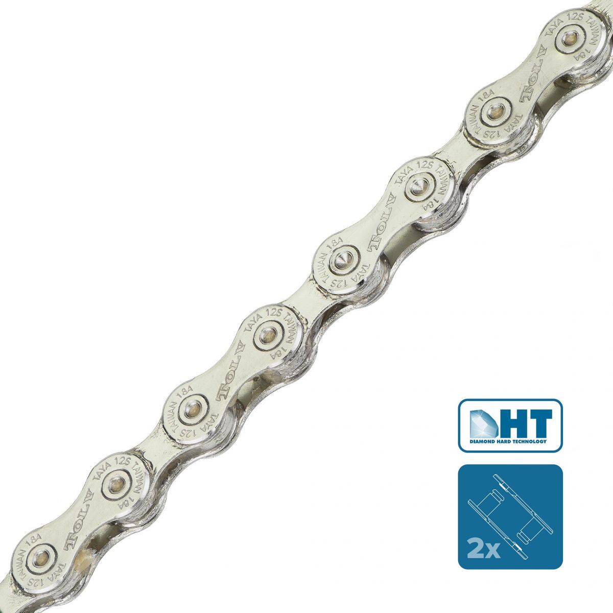 Cadena Taya de 12 velocidades compatible con Shimano y Sram con tratamiento de endurecimiento Diamond Hard Technology (DHT) consigue una durabilidad ocho veces superior a la de cualquier otra cadena del mercado. Las cadenas con este tratamiento tienen una dureza por encima de HK 1800, un 25% superior a la competencia.