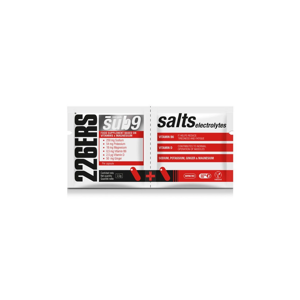 Mantente en plena forma durante tus entrenamientos más exigentes con las cápsulas SUB9 SALTS ELECTROLYTES de 226ERS. Este suplemento alimenticio está formulado con jengibre, vitaminas y minerales para combatir la deshidratación, la acumulación de ácido láctico y los calambres musculares durante el ejercicio. Su formato Duplo facilita el transporte y asegura una conservación óptima de las cápsulas, permitiéndote llevarlas contigo y consumirlas fácilmente durante tus actividades físicas.