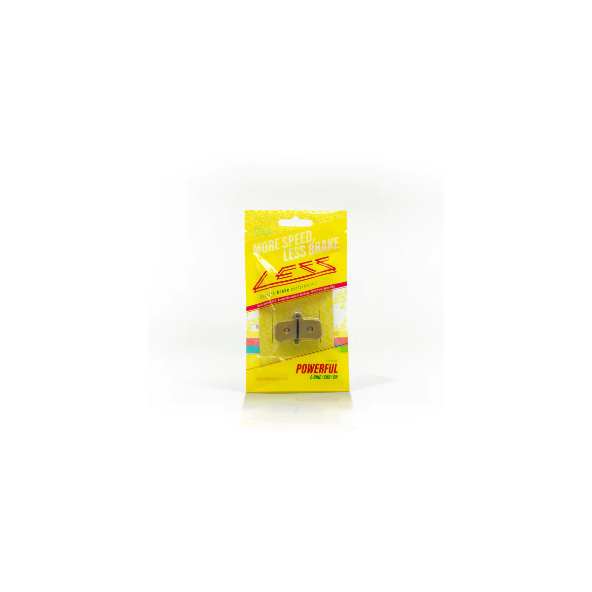 Pastillas de freno LESS BRAKES POWERFUL para frenos Shimano de 4 pistones y TRP, diseñadas para un rendimiento agresivo en disciplinas como Downhill, Enduro y E-Bikes.